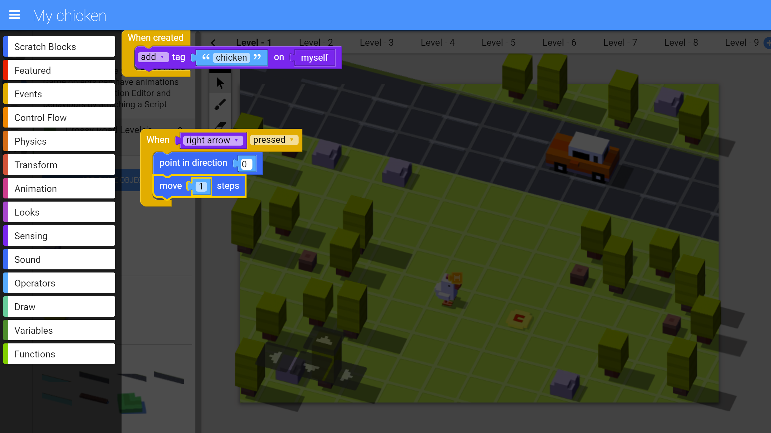 Na kraju smo imali i praktičan primer na igrici „Zašto je pile prešlo preko puta?“; želeo sam da im pokažem vezu između objekata na ekranu i akcija koje igrači čine na tastaturi. Trebalo je pomeriti pile 2 koraka desno, ali nije bilo nikakvog programskog koda koji bi to omogućio. Deca su se javljala da dođu do računara, da pokušaju da pomere pile pre programskog koda, i da pomere nakon. Ovo „programski kod“ bi trebalo uzeti sa rezervom, jer je primer koji sam im dao bio vizuelno programiranje gde smo uzeli element pritiska na tastaturu i element pomeranja za 1 korak. Nije bila ideja da nauče da programiraju, nego da nauče da razmišljaju.